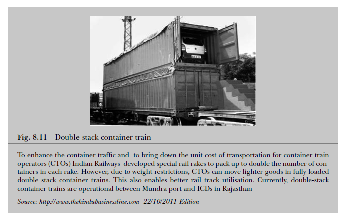 The container services in India were started in 1966 and initially containers with payload of 5 tonnes were introduced. IR first started container service between Mumbai and Ahmedabad in 1968. However, slowly the railway rakes were developed to adopt the large size containers of 20 feet and 40 feet length. Till 1988, the growth of container traffic was very slow. However in 1988, Container Corporation of India (CONCOR) under the Ministry of Railways was formed to look after the container traffic in India (Table 8.6).