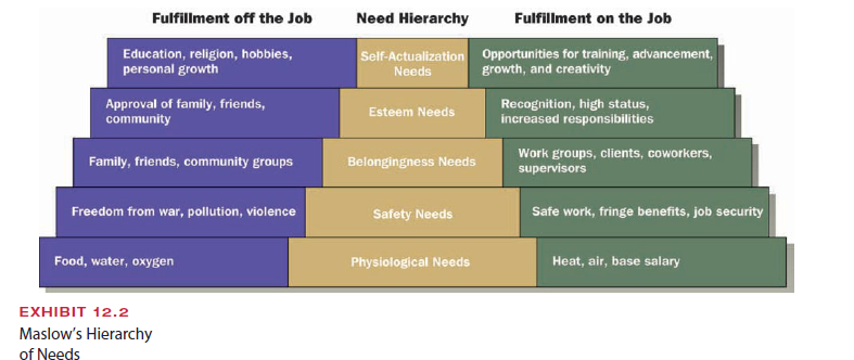 Probably the most famous content theory was developed by Abraham Maslow.8 Maslow’s hierarchy of needs theory proposes that people are motivated by multiple needs and that these needs exist in a hierarchical order, as illustrated in Exhibit 12.2. Maslow identified five general types of motivating needs in order of ascendance: