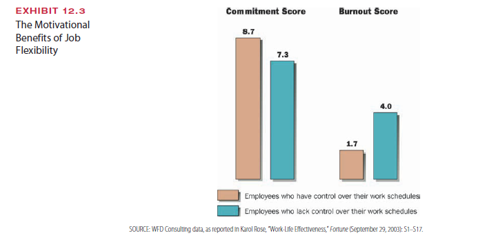 Many companies are finding that creating a humane work environment that allows peo-ple to achieve a balance between work and personal life is also a great high-level motivator. Flexibility in the workplace, including options such as telecommuting, flexible hours, and job sharing, is highly valued by today’s employees because it enables them to manage their work and personal responsibilities. Flexibility is good for organizations too. Employees who have control over their work schedules are significantly less likely to suffer job burnout and are more highly committed to their employers, as shown in Exhibit 12.3. This idea was sup- ported by a survey conducted at Deloitte, which found that client service professionals cited workplace flexibility as a strong reason for wanting to stay with the firm. Another study at Prudential Insurance found that work-life satisfaction and work flexibility directly corre- lated to job satisfaction, organizational commitment, and employee retention.14