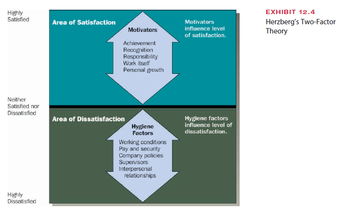 The two-factor theory is illustrated in Exhibit 12.4. The center of the scale is neutral, meaning that workers are neither satisfied nor dissatisfied. Herzberg believed that two en- tirely separate dimensions contribute to an employee’s behavior at work. The first, called hygiene factors, involves the presence or absence of job dissatisfiers, such as working conditions, pay, company policies, and interpersonal relationships. When hygiene factors are poor, work is dissatisfying. However, good hygiene factors simply remove the dissatis- faction; they do not in themselves cause people to become highly satisfied and motivated in their work.