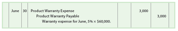 To illustrate, assume that during June a company sold a product for $60,000 that includes a 36-month warranty for repairs. The average cost of repairs over the warranty period is 5% of the sales price. The entry to record the estimated product warranty expense for June is as shown below.