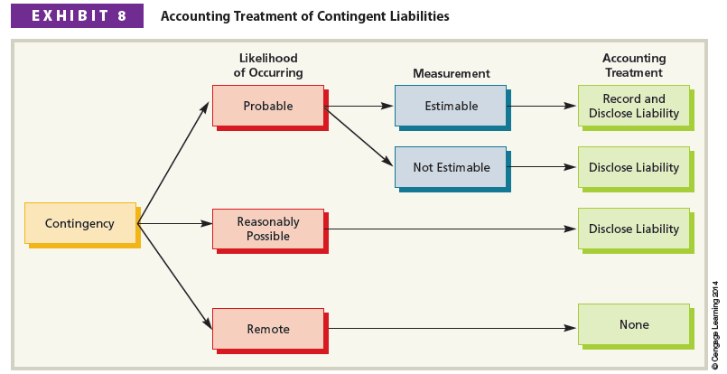 A contingent liability may be remote. For example, a ski resort may be sued for injuries incurred by skiers. In most cases, the courts have found that a skier accepts the risk of injury when participating in the activity. Thus, unless the ski resort is grossly negligent, the resort will not incur a liability for ski injuries. In such cases, no disclosure needs to be made in the notes to the financial statements. The accounting treatment of contingent liabilities is summarized in Exhibit 8.