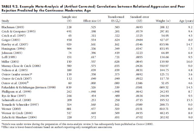 Because this weighted regression approach to testing continuous moderators is most clearly illustrated through example, let me return to the sample meta-analysis of associations between relational aggression and peer rejection. As shown in Table 9.2, I coded the mean age (in years) of the samples for these 22 studies, and I want to evaluate whether age moderates the asso-ciations between relational aggression and rejection. To do so, I regress the effect sizes (Fisher’s transformation of the correlation between relational aggression and rejection, Zr) onto the hypothesized continuous moderator age, using the familiar regression equation. Zr = Bq + B]_(Age) + e, with w as a weight. To do this, I use a standard statistical software package such as SPSS or SAS. In SPSS, I would specify Zr as the dependent variable, age as the independent variable, and w as the WLS (weighted least squares) weight.