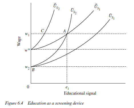 It is worth noticing that, as the figure is drawn, the screening mechanism has harmed the less skilled while leaving the more skilled at the same utility level as they would have enjoyed if a single contract at w* had been offered. From a social point of view, therefore, screening or signalling may not always result in benefits. Further, the social opportunity cost of the resources used in providing the signal does not appear in the figure. However, the model has been presented in a particularly extreme form. If the process of acquiring the education itself increases productivity, or if the internal training procedures of the firm are more effective because of the information provided by the signal, signalling or screening can have productive and not merely redistributional consequences.