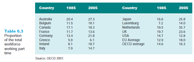 Since the 1960s the proportion of the employed workforce on part-time contracts has increased dramatically. Around a quarter of us (seven million) now work on a part-time basis, compared to just 9 per cent in 1961. Between 1992 and 2006 the number of fulltime jobs in the UK increased by 10 per cent, while the rate of increase in part-time jobs was 23 per cent. Here too, however, there has been a modest reduction in the most recent years, the figure peaking in 2004. Table 6.3 shows that this proportion is greater than that in most other countries, although there is some difficulty in making precise comparisons because the definition of what constitutes a part-time job varies somewhat from country to country. Whatever the definition used, however, it is clear that the number of part-timers across the world has steadily grown over recent decades. Only in the USA has the number declined of late.