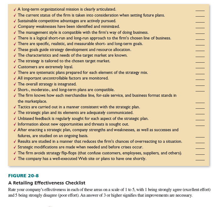 A RETAILING EFFECTIVENESS CHECKLIST Figure 20-8 has another type of audit form to assess performance and prepare for the future: a retailing effectiveness checklist. It can be used by small and large firms alike. The checklist is more strategic than the Management Audit for Small Retailers—which is more tactical. Unlike the yes-no answers in Figure 20-7, the checklist lets a retailer rate its performance from 1 to 5 in each area; this provides more in-depth information. However, a total score should not be computed (unless items are weighted), because all items are not equally important. A simple summation would not be a meaningful score.