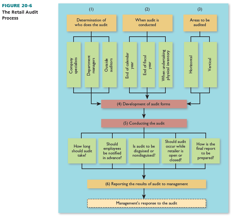 There are six steps in retail auditing. See Figure 20-6 for an overview of the retail auditing process, which is described next: (1) Determine who does an audit. (2) Decide when and how often an audit is done. (3) Establish the areas to be audited. (4) Develop audit form(s). (5) Conduct the audit. (6) Report to management.