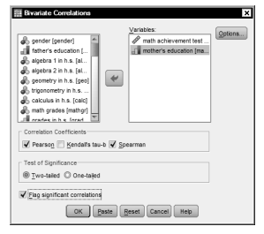 The Pearson product moment correlation is a bivariate parametric statistic used when both variables are approximately normally distributed (i.e., scale data). When you have ordinal data or when assumptions are markedly violated, one should use a nonparametric equivalent of the Pearson correlation coefficient. One such nonparametric, ordinal statistic is the Spearman rho (another is Kendall’s tau, which we computed in the last chapter). Here you will compute both parametric and nonparametric correlations and then compare them. The variables of interest for Problem 8.2 are mother’s education and math achievement. We found in Chapter 4 that mother’s education was somewhat skewed, but that math achievement was normally distributed.