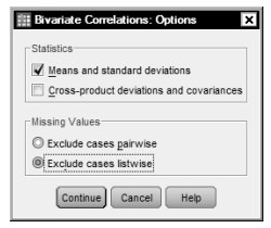 - Click on Means and standard deviations and click on Exclude cases listwise. When requesting only one correlation, listwise and pairwise exclusion (of participants with missing data on one or both of these variables) are the same, but, as described later, which one you select may make a difference in a correlation matrix of more than one pair of variables.