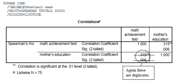 The first table provides descriptive statistics (mean, standard deviation, and N) for the variables to be correlated, in this case math achievement and mother’s education. The two tables labeled Correlations are our primary focus. The information is displayed in matrix form, which unfortunately means that every number is presented twice. We have provided a call out box to help you.
