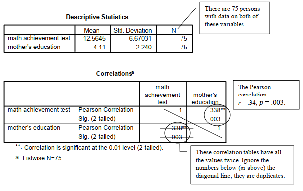 The first table provides descriptive statistics (mean, standard deviation, and N) for the variables to be correlated, in this case math achievement and mother’s education. The two tables labeled Correlations are our primary focus. The information is displayed in matrix form, which unfortunately means that every number is presented twice. We have provided a call out box to help you.