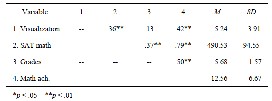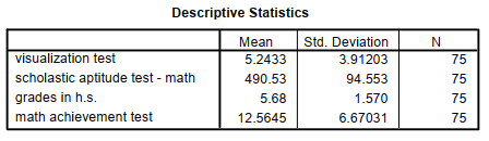 - What are the associations among the four variables visualization, scholastic aptitude test— math, grades in h.s., and math achievement?