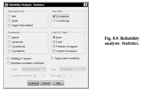 - Click on Statistics to get the Reliability Analysis: Statistics window (See Fig. 8.9).