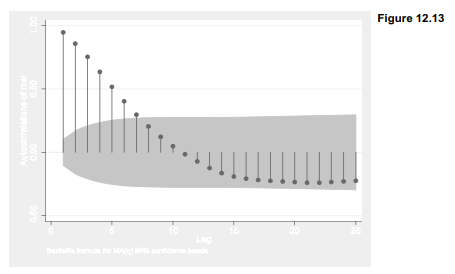 The resulting correlogram, Figure 12.13, includes a shaded area marking pointwise 95% confidence intervals. Correlations outside of these intervals are individually significant. The lags(25) option extends this graph to a 25-month lag, revealing that autocorrelations of mei become negative after about 12 months. This pattern reflects the quasi-oscillatory character of ENSO: high periods have some tendency to be followed by low ones, and vice versa.