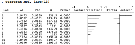 Lags appear at the left side of the table, followed by columns of autocorrelations (AC) and partial autocorrelations (PAC). For example, the correlation between meit and mei;_2 is .8582, and the partial autocorrelation (adjusted for lag 1) is -.4181. The Q statistics (Ljung-Box portmanteau) test a series of null hypotheses that all autocorrelations up to and including a given lag are zero. Because the p-values seen here are all very small, we should reject the null hypotheses and conclude that the Multivariate ENSO Index (mei) exhibits significant autocorrelation. If none of the Q statistic probabilities had been below .05, we might conclude instead that the series was white noise with no significant autocorrelation.
