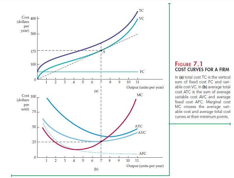 Another way to see the relationship between the total cost curves and the average and marginal cost curves is to consider the line drawn from origin to point A in Figure 7.1 (a). In that figure, the slope of the line measures average variable cost (a total cost of $175 divided by an output of 7, or a cost per unit of $25). Because the slope of the VC curve is the marginal cost (it measures the change in variable cost as output increases by 1 unit), the tangent to the VC curve at A is the marginal cost of production when output is 7. At A, this mar- ginal cost of $25 is equal to the average variable cost of $25 because average variable cost is minimized at this output.