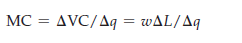 Let’s look at the relationship between production and cost in more detail by concentrating on the costs of a firm that can hire as much labor as it wishes at a fixed wage w. Recall that marginal cost MC is the change in variable cost for a 1-unit change in output (i.e., AVC/Aq). But the change in variable cost is the perunit cost of the extra labor w times the amount of extra labor needed to produce the extra output AL. Because AVC = wAL, it follows that