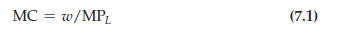 Equation (7.1) states that when there is only one variable input, the marginal cost is equal to the price of the input divided by its marginal product. Suppose, for example, that the marginal product of labor is 3 and the wage rate is $30 per hour. In that case, 1 hour of labor will increase output by 3 units, so that 1 unit of output will require 1/3 additional hour of labor and will cost $10. The mar- ginal cost of producing that unit of output is $10, which is equal to the wage,