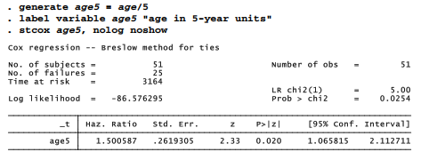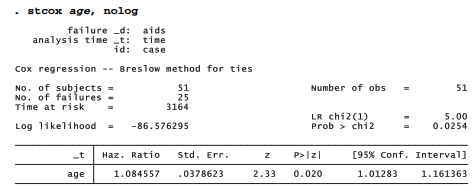 Thus, the hazard of AIDS onset is about 50% higher when the second person is five years older than the first. Alternatively, we could learn the same thing (and obtain the new confidence interval) by repeating the regression after creating a new version of age measured in five-year units. The nolog noshow options below suppress display of the iteration log and the st-dataset description.