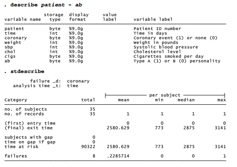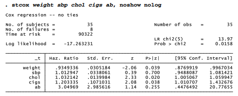 Like ordinary regression, Cox models can have more than one independent variable. Dataset heart.dta contains survival-time data from Selvin (1995) on 35 patients with very high cholesterol levels. Variable time gives the number of days each patient was under observation. coronary indicates whether a coronary event occurred at the end of this time period (coronary = 1) or not (coronary = 0). The data also include cholesterol levels and other factors thought to affect heart disease. File heart.dta was previously set up for survival-time analysis by an stset time, failure(coronary) command, so we can go directly to st analysis.