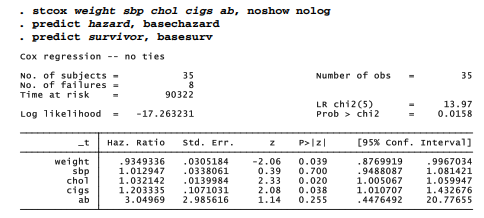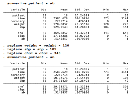 After estimating the model, we can predict new variables holding the estimated baseline cumulative hazard and survivor functions. Since “baseline” refers to a situation with all x variables equal to zero, however, we first need to center some variables so that 0 values make sense. A patient who weighs 0 pounds, or has 0 blood pressure, does not provide a useful comparison. Guided by the minimum values actually in our data, we might shift weight so that 0 indicates 120 pounds, sbp so that 0 indicates 105, and chol so that 0 indicates 340: . summarize patient – ab