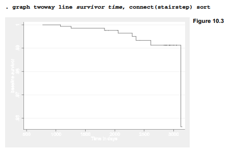 Note that centering three x variables had no effect on the hazard ratios, standard errors and so forth. The predict commands created two new variables, arbitrarily named hazard and survivor. To graph the baseline survivor function, we plot survivor against time and connect data points in a stairstep fashion, as seen in Figure 10.3.