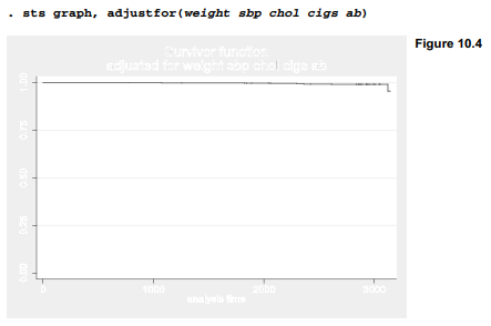 The same baseline survivor-function graph could have been obtained another way, without stcox. The alternative, shown in Figure 10.4, employs an sts graph command with adjustfor( ) option listing the predictor variables.