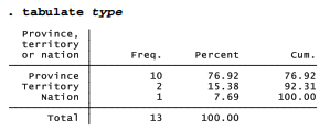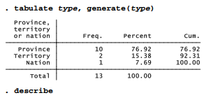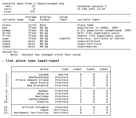 A previous section illustrated how to construct a categorical variable called type to distinguish among territories, provinces and nation in our Canadian dataset. You can create categorical or ordinal variables in many other ways. This section gives a few examples.