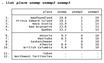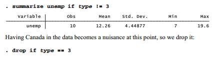 Two commands create a dummy variable named unemp2 with values of 0 when unemployment is below average (12.26), 1 when unemployment is equal to or above average, and missing when unemp is missing. In reading the second command, recall that Stata’s sorting and relational operators treat missing values as very large numbers.
