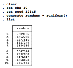 The pseudo-random number function runiform() lies at the heart of Stata’s ability to generate random data or to sample randomly from the data at hand. The Base Reference Manual (Functions) provides a technical description of this 32-bit pseudo-random generator. If we presently have data in memory, then a command such as the following creates a new variable named randnum, having apparently random 16-digit values over the interval [0,1).