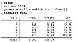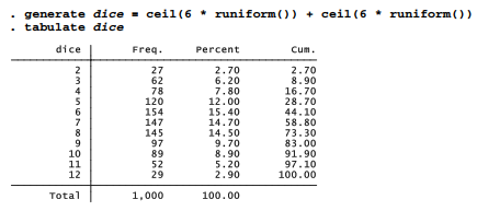 In combination with Stata’s algebraic, statistical and special functions, runiform() can simulate values sampled from a variety of theoretical distributions. If we want newvar sampled from a uniform distribution over [0,428) instead of the usual [0,1), we type