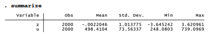 To generate random variables from a normal (Gaussian) distribution, use the function rnormal(). The following example creates a dataset with 2,000 observations and 2 variables: z from an N(0,1) population, and u from N(500,75).