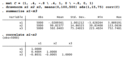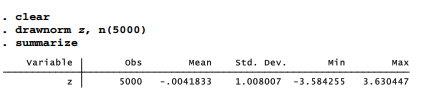 The drawnorm command provides an alternative way to generate multiple normal variables, and optionally to specify the correlations between them. Using drawnorm to generate 5,000 observations of just one variable from N(0,1), type