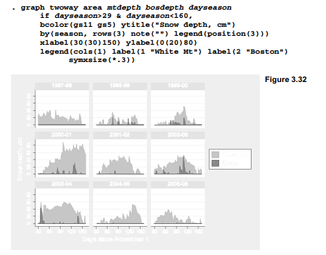 One of Tufte’s themes is the value of small multiples, sets of thumbnail-sized graphics that add dimensions for comparison. A graph command with by( ) option can draw these nicely. Figure 3.32 illustrates with time plots of winter snow depth at two locations: a town in New Hampshire’s White Mountains, and the city of Boston, 225 kilometers to its south (dataset whitemtl.dta). Snow depth was measured daily at both locations; these data cover nine consecutive winters, 1997-98 through 2005-2006. Variable dayseason counts days since November 1 each winter season. mtdepth and bosdepth are snow depths in centimeters at the White Mountains location and in Boston, respectively. Variable season identifies the winter seasons, 1997-98 through 2005-06. The following command specifies a twoway area graph of mtdepth and bosdepth against dayseason, using lighter and darker gray (gs11 and gs5) for colors, in a 3*3 layout by season, and with a one-column legend positioned at 3 o’clock. symxsize(*.3) saves space by making the legend’s symbols only 30% as wide as their default.