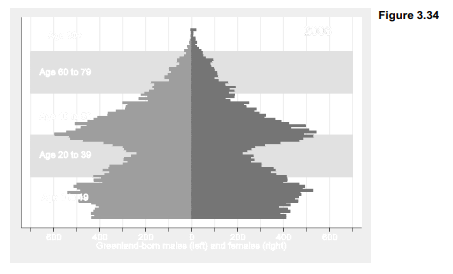 Population pyramids, widely used by demographers to represent the age-sex structure of populations, are not among Stata’s plot types. They can, however, be constructed from horizontal bar charts, through creative use of graph hbar. There are several ways to do so. Figure 3.34 illustrates one approach, with a pyramid for the Greenland-born, predominantly Inuit, population of Greenland in 2006 (Hamilton and Rasmussen 2010). The number of females at each age is indicated by a bar to the right of center, and the number of males that same age by a bar to the left. The 90 one-year age groups seen here are too many to label individually, so they are marked off instead by gray bands every 20 years (0-19 years, 20-39 years, etc.). The graph indicates, for example, that in 2006 the Greenland-born population included almost 600 40-year-old males but fewer than 500 40-year-old females, reflecting sex differences in net outmigration. The central bulge in this pyramid marks a baby boom of adults now ages 35-49 (born in the 1950s and 60s), followed by much smaller cohorts of younger adults. We also see an echo boom of children, born in the 1980s and 90s to adults from the first baby boom. Ages 10-14 comprise the most numerous cohort among children.