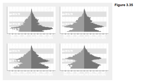 Figure 3.34 now can be drawn by stacking negmales, females, maleGRAY and femGRAY in a horizontal bar chart, with text to label the gray bands. We also apply labels such as “600” for -600 on the y axis so that the counts for males do not appear negative.