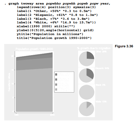 Figure 3.36 is less dynamic, but combines five simple plots with text to form an image having some properties ofboth an illustration and a table. The resulting Stata graphic depicts population changes 1990-2000 among different ethnic groups living in rural counties of the U.S. South (based on U.S. Census data assembled by Voss et al. 2005). The left side of Figure 3.36 is a twoway area graph. To achieve the ramped effect showing population change, the variables graphed for each ethnic group (popwbho, popwbh etc.) actually represent sums calculated as that group’s population plus all the other populations that are graphically “below” it (dataset southmigl.dta). Important additional information, not evident from the area plot itself, is conveyed by two lines of labeling for each group in the legend. For example, readers can see from the legend that the Hispanic population of the rural South grew by 61% over this decade, from roughly 800,000 to 1.3 million people, and make their own visual or numerical comparisons with other populations.