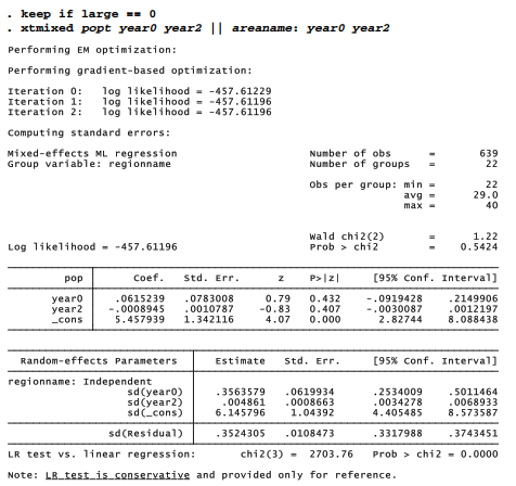 This section applies xtmixed to a different kind of multilevel data: cross-sectional time series. Dataset Alaskaregions.dta contains time series of population for each of the 27 boroughs, municipalities or census areas that together make up the state of Alaska. These 27 regions are a fragment from the pan-Arctic human-dimensions database framework described by Hamilton and Lammers (2011). In Alaska regions.dta, a dummy variable named large marks the five most populous Alaska regions, those having 2011 populations greater than 20,000. The other 22 regions are predominantly rural, and their smaller populations might be widely dispersed. The Northwest Arctic borough, for example, covers a geographic area larger than the state of Maine, but had a 2011 population of fewer than 8,000 people. For each of the 27 regions there are multiple years of data, ranging from 1969 to 2011 but with many missing values. Thus, for each variable there are 27 parallel but often incomplete time series.