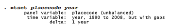 These data have been declared as panel through an xtset command that specified placecode as the panel variable and year as the time variable: