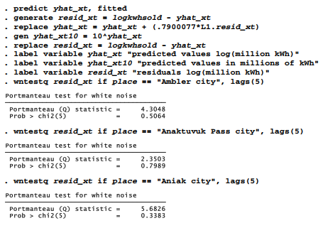 As noted in Chapter 12, time series often are tested for stationarity before modeling, to avoid reaching spurious conclusions. Differencing provides one set oftools. Alternatively, even when the original series are nonstationary, as in this example (or the ARMAX models in Chapter 12), we can seek a linear combination of the variables that is stationary (cotntegration; see Hamilton 1994). Model [13.8] serves well for this purpose. None of the 42 residual series (one series for each community) generated by this model show significant autocorrelation, as tested by Ljung- Box portmanteau Q statistics. Thus, residuals are not distinguishable from white noise, a covariance stationary process. The following commands calculate predicted values taking the autoregressive term into account (yhat xt), then use those predictions to calculate residuals (restdxt). White-noise Q tests (wntestq) showing no residual autocorrelation are illustrated below for the first 3 out of 42 communities.