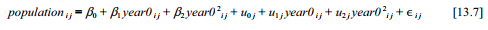 Because population trends have not simply gone upwards, they cannot realistically be modeled as a linear function of year. The mixed model below represents population trends as a quadratic function, regressing population in thousands (pop) on years since 1968 (year0) and also on year0 squared. We allow for fixed (/() and random (u ) intercepts and slopes on both terms. The 5 large-population regions are set aside for these analysis, in order to focus on rural Alaska.