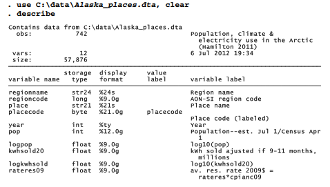 A more substantive analysis using mixed-effects regression to model relationships involving multiple time series appears in a paper on population, climate and electricity use in towns and villages of Arctic Alaska (Hamilton et al. 2011). Dataset Alaska_places.dta contains the core data for this analysis, consisting of annual time series for each of 42 towns and villages in Arctic Alaska, all within five of the census regions or boroughs graphed in Figure 13.9 above. Variables include community population, kilowatt hours of electricity sold, the average rate charged for electricity (in constant 2009 dollars), and estimates of the summer temperature and precipitation around that location each year. The paper supplies information about variable definitions, data sources and the context for this analysis.