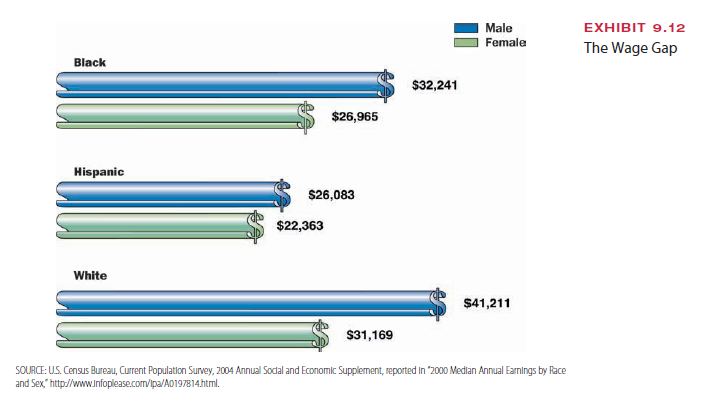 Women and minorities also make less money. As shown in Exhibit 9.12, black men earn about 22 percent less, white women 24 percent less, and Hispanic men 37 percent less than white males. Minority women fare even worse, with black women earning 35 percent less and Hispanic women 46 percent less than white males.151