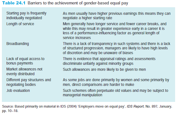 Pay differentials between men and women have narrowed very little except for a hike of women’s pay upwards when the Equal Pay Act 1970 came into force in 1975. According to the Annual Survey of Hours and Earnings 1997-2006 (Dobbs 2007) the mean hourly rate for full-time women is 17.2 per cent lower than that for men, having increased from around 30 per cent lower prior to the Equal Pay Act. However, if overtime is included the current gap widens as men work a greater number of hours. Remembering that around 50 per cent of women work part-time, the same survey shows that the median hourly rate of part-timers (women and men) is 37 per cent less than that for full-timers, with overtime excluded. While some progress has been made towards equal pay and the gap continues to slowly narrow, these factors still remain as barriers to be overcome. The abolition of the wages councils has not helped in this respect, but the minimum wage has provided some limited support. IDS (2004) identifies a range of unintentional consequences of pay systems which prove to be a barrier to achieving equal pay, and these are shown in Table 24.1.