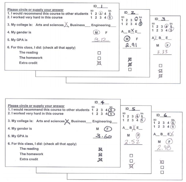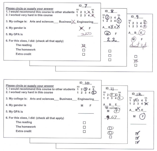 to see if there are double answers to a question (when only one is expected) or answers that are marked between two rating points. If this happens, you need to have a rule (e.g., “use the average”) that you can apply consistently. Thus, you should “clean up” your data, making sure they are clear, consistent, and readable, before entering them into a data file.