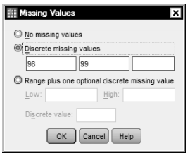 - Under Missing, click on None and then on the three dots. Click on Discrete Missing Values and enter 98 and 99 in the first two boxes. (See Fig. 2.10.) This step is essential if you have one or more specific values that you want to use as missing value code(s). If you leave the Missing cell at None, the program will not know that 98 and 99 should be considered missing. None in this column is somewhat misleading. None means no special missing values (i.e., only blanks are considered missing).