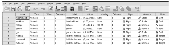 - Change Role to Both because recommend could be used as either an Input (independent) or a Target (dependent) variable. See Figure 2.7. Different researchers might code these variables differently. For example, if they planned to use recommend only as an independent variable in their study, they would code Role as Input.