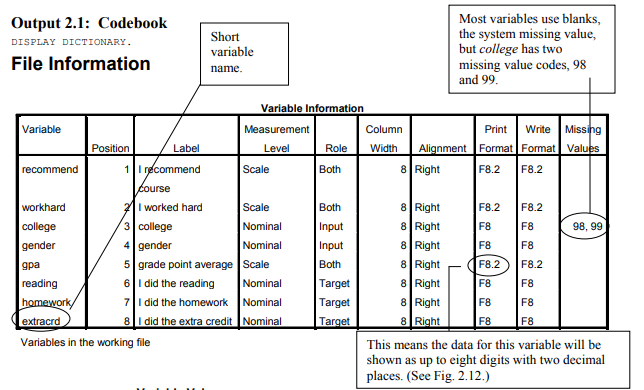 - Select File → Display Data File Information → Working File. Your codebook should look like Output 2.1, without the callout boxes. The codebook is divided into parts: the Variable Information (which is very similar to the variable view in Fig. 2.12) and the Variable Values (which are partially hidden in the variable view).