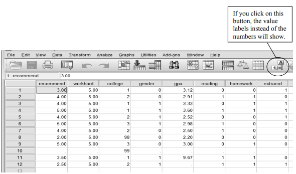 After defining and labeling the variables, your next task is to enter the data directly from the questionnaires or from a data entry form. Sometimes researchers transfer the data from the questionnaires to a data entry form (like Table 2.1) by hand before entering the data into SPSS. This may be helpful if the questionnaires or answer sheet are not easily readable by the data entry person, if the responses are to be entered from several different sources, or if additional coding or recoding is required before data entry. In these situations, you could make mistakes entering the data directly from the questionnaires.
