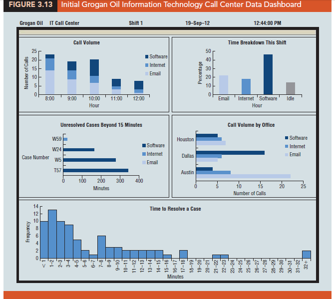To illustrate the use of numerical measures in a data dashboard, recall the Grogan Oil Company application that we used in Section 2.5 to introduce the concept of a data dashboard. Grogan Oil has offices located in three Texas cities: Austin (its headquarters), Houston, and Dallas. Grogan’s Information Technology (IT) call center, located in the Austin office, handles calls regarding computer-related problems (software, Internet, and email) from employees in the three offices. Figure 3.13 shows the data dashboard that Grogan developed to monitor the performance of the call center. The key components of this dashboard are as follows: